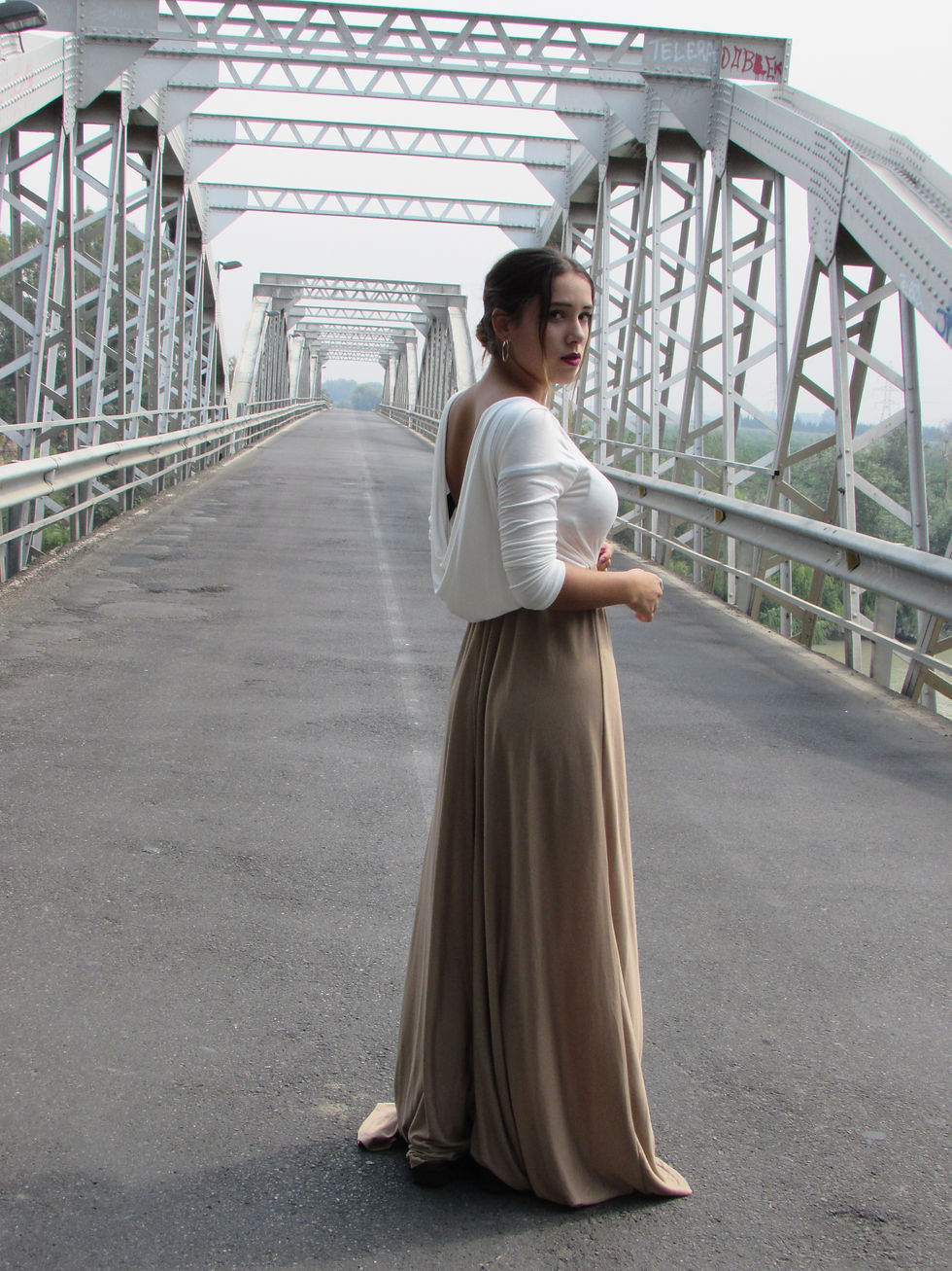 Se trata de un vestido con un color nude, dando la impresión de ser de dos partes: top y falda larga. La parte superior es blanca, con la espalda al descubierto y con cuello en forma de barco. La falda larga es de color marrón clarito, con un tejido bastante fino. Me parece perfecto con unos tacones marrones para alguna ocasión como boda, algún cumpleaños especial como una puesta de largo, un evento importante...